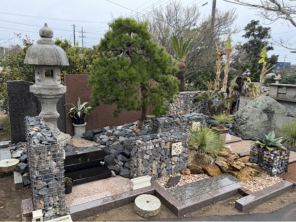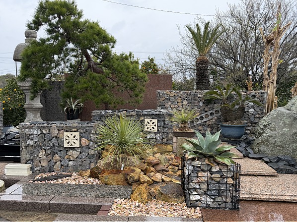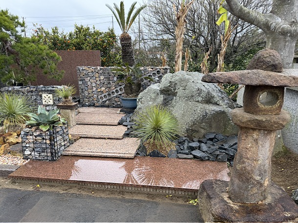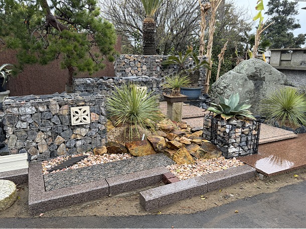 石の質感を主役にしながら、植栽や構造物をバランスよく組み合わせた立体感のある構成です。
