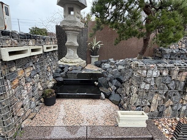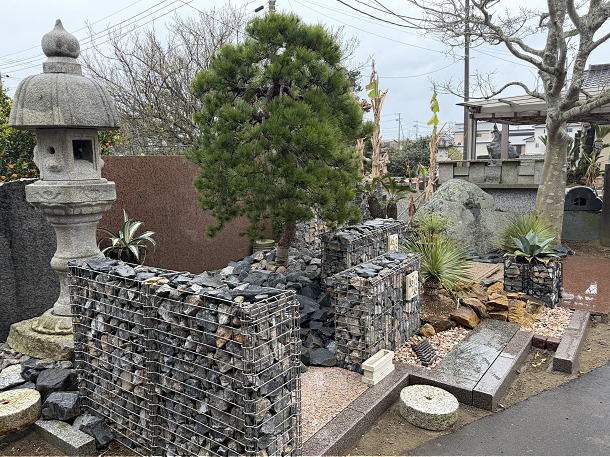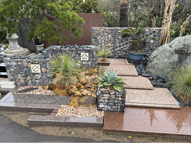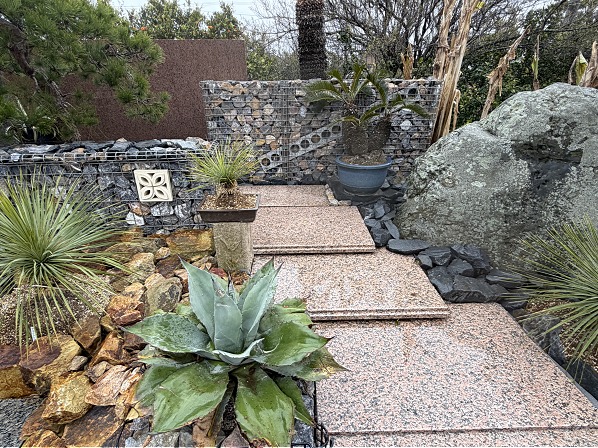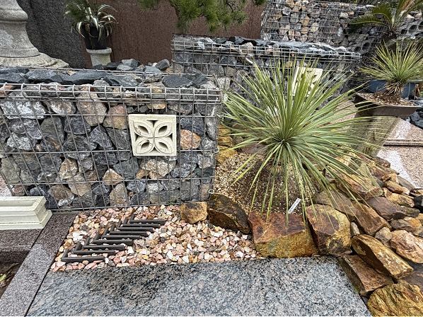 特に今回のように、ガビオンや石のアプローチ、既存物の活用など、異なる要素をひとつの空間にまとめる場合は、全体のバランスを見ながら慎重に仕上げていきます。